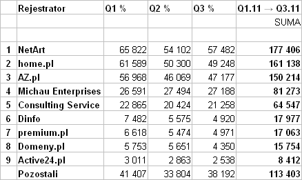 Na koniec tabelka pokazująca liczbę nowych rejestracji domen w poszczególnych kwartałach 2011 roku. Ostatnia kolumna przedstawia sumaryczną liczbę nowych rejestracji w pierwszych trzech kwartałach 2011 roku. Miejsca na podium zajęły: NetArt, home.pl, AZ.pl – od 150 do 177 tysięcy rejestracji nowych domen w okresie od stycznia do września 2011. Niezłym wynikiem mogą pochwalić się też firmy z miejsca czwartego (Michau Enterprises – 81 tys. nowych rejestracji .pl) oraz piątego (Consulting Service – 64 tys. nowych rejestracji .pl). Grupa rejestratorów Pozostali zarejestrowała w sumie 113 tys. nowych domen .pl w pierwszych dziewięciu miesiącach 2011 roku.