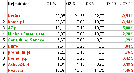 Poniższa tabelka pokazuje procentowy udział rejestratorów domen w poszczególnych kwartałach 2011 roku. Ostatnia kolumna przedstawia zmianę udziału w okresie od końca trzeciego kwartału 2010 do końca trzeciego kwartału 2011. Jak widać, tylko trzech rejestratorów odnotowało przyrost: Michau Enterprises (Aftermarket.pl), AZ.pl i Consulting Service (rejestracjadomen.pl). Przyrost zanotowała też grupa Pozostali, do której zaliczają się rejestratorzy poza TOP 10 oraz te firmy, które nie pozwoliły na udostępnienie ich statystyk publicznie. Wśród nich znajduje się między innymi rejestrator 1 and 1. Największe straty udziałów w rynku ponieśli home.pl i NetArt (nazwa.pl).