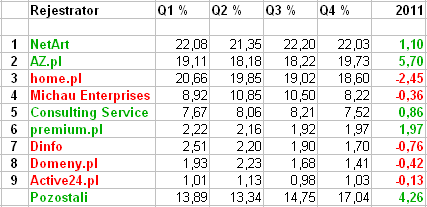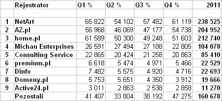 Poniższa tabelka pokazuje procentowy udział rejestratorów domen w poszczególnych kwartałach 2012 roku. Ostatnia kolumna przedstawia zmianę udziału w całym roku 2012.